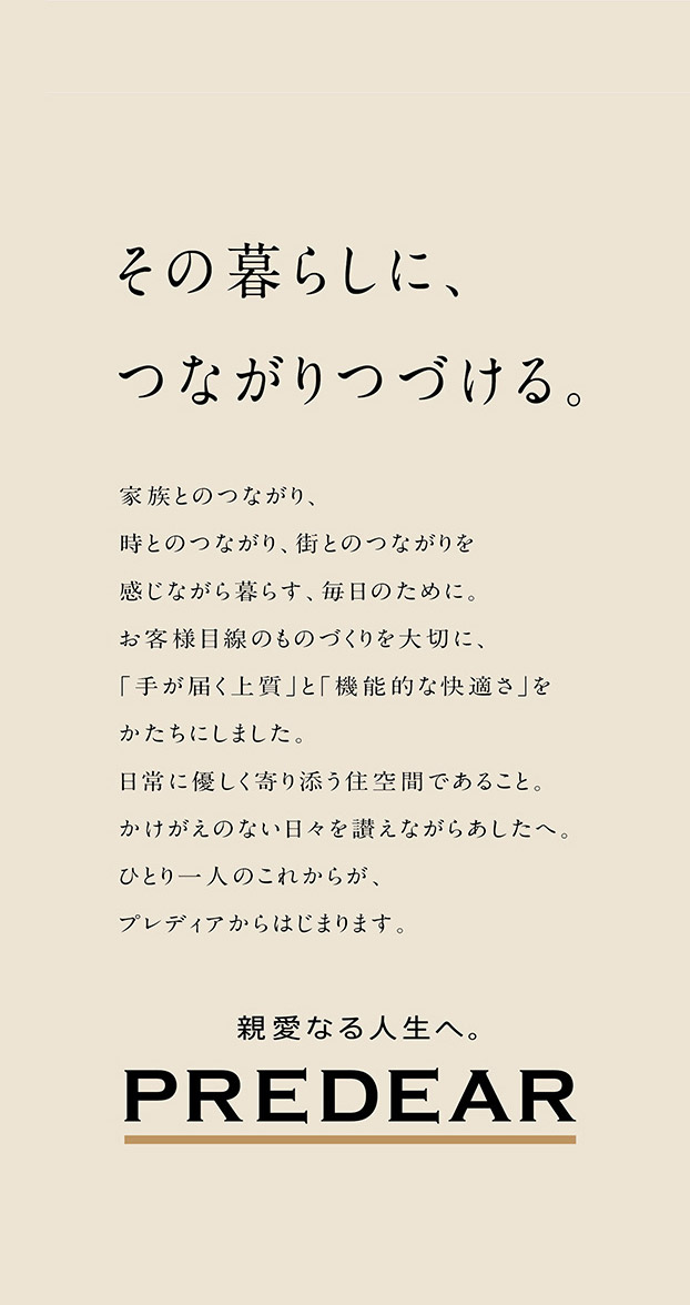 プレディアのブランドコンセプト「暮らしにつながり続けるまちづくり」の想いを形に。 「家族」、「まち」、「時」とつながる暮らしを大切にし、商品企画・空間づくりをしています。