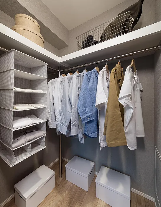 ワードローブをかけられるハンガーパイプと、収納するアイテムの大きさに合わせて位置を調整できる棚を設置しました。