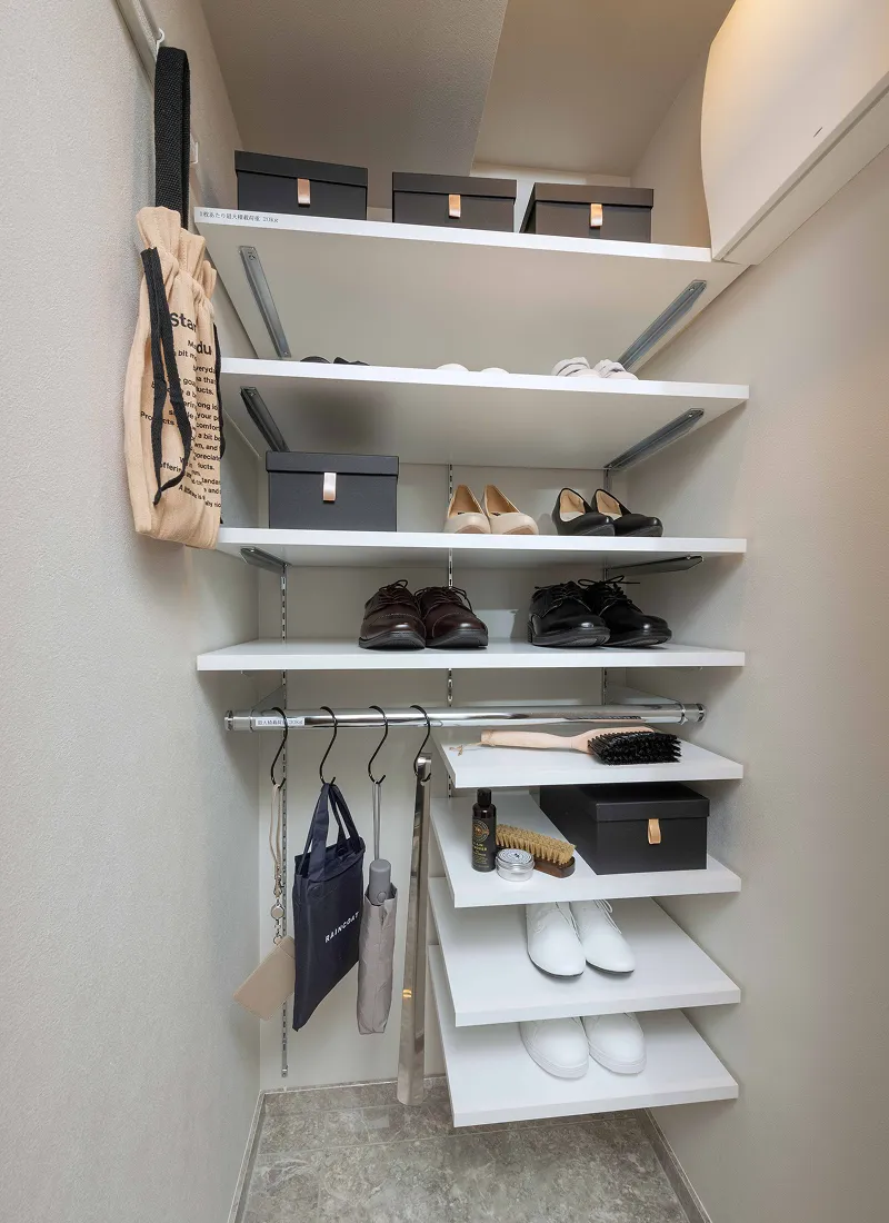 たくさんの靴はもちろん、ベビーカーやゴルフバックなどのかさばるアイテム、濡れた傘やレインコートなどの収納にも便利です。