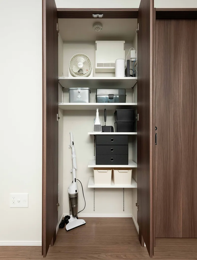 リビング・ダイニングに設置した物入には、スティック型掃除機の充電などに便利なコンセントを備えています。