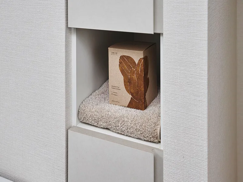 タオルやバス用品などの収納庫として重宝。一部タイプ(A・Aa・Asタイプ)にはカウンターのように使えるオープン棚を採用しました。