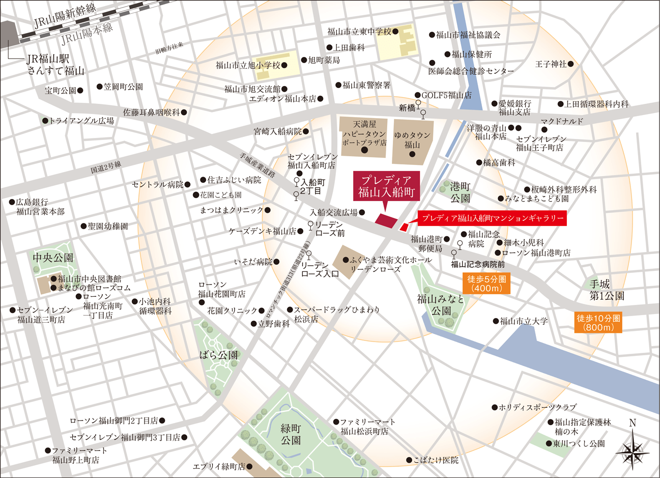 この「ポートプラザ」の南側の隣接地に誕生する「プレディア福山入船町」は、福山初のJR西日本プロパティーズの新築分譲マンションです。全邸南向き、ワンフロア4邸、角住戸率50%の全52邸。開放感溢れる東南角地で、周辺には公園も多く、通りの向かいは文化施設「リーデンローズ」。徒歩5分以内で街の賑わい、緑の潤い、文化の香り全てが享受できます。