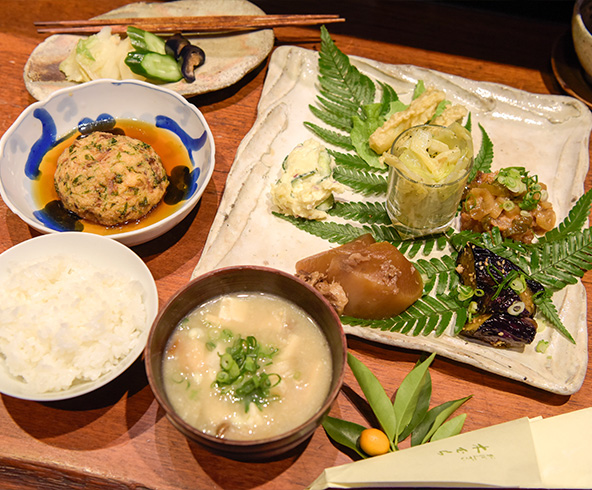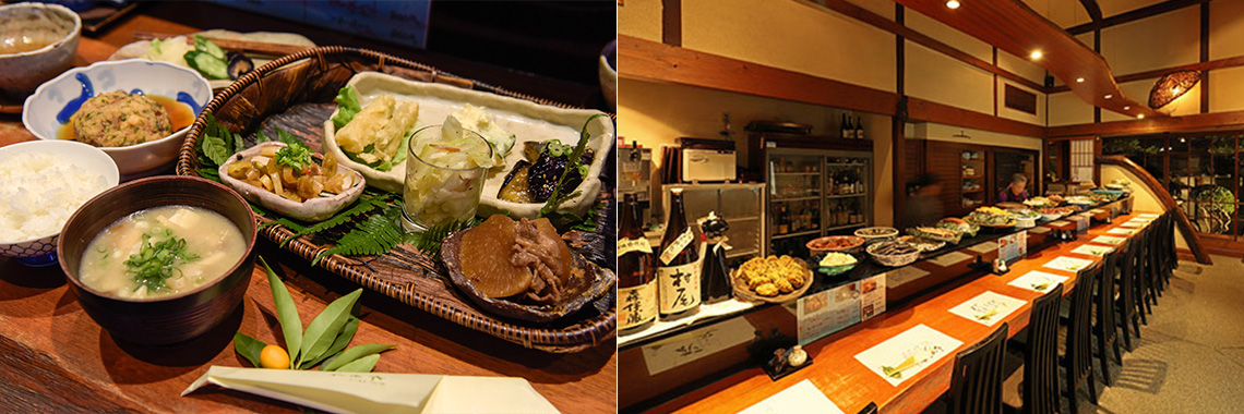 現地の近くには外食が楽しめる素敵なお店も豊富です。「おばんざい木むら」は、昭和15年に建てられた古民家を改装した家庭料理店。厳選された旬の素材を用いた日替わりの「おばんざい」20種類以上が大皿でカウンターに並び、お好きな料理が注文できます。テイクアウトもできるので、夕飯のおかずにすることも。月火水はランチタイムも営業しています。