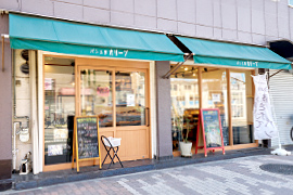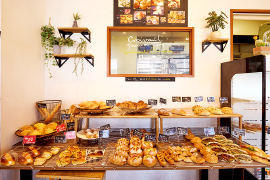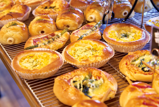 パン工房 オリーブたくさんのパンが並ぶ全面ガラスの店内には明るい陽光があふれています。人気はカレーパンと塩パン。早々に売り切れることもあるそう。大きなシェルクロワッサンや湯種食パンも地域の方に根強い人気です。