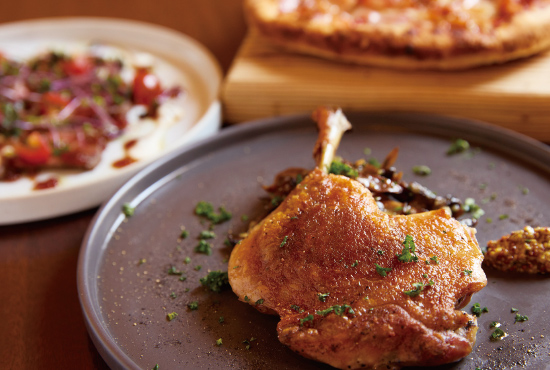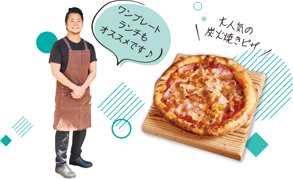 小田舎料理店“ここでしか味わえないイタリアン”をコンセプトに、新鮮な野菜を使用するなど、素材を生かしたひと皿を提供。炭火焼きピザは、最後の仕上げにベーコンやチーズに炭火を直に押付けることで香ばしい薫りが漂い、食をそそります。