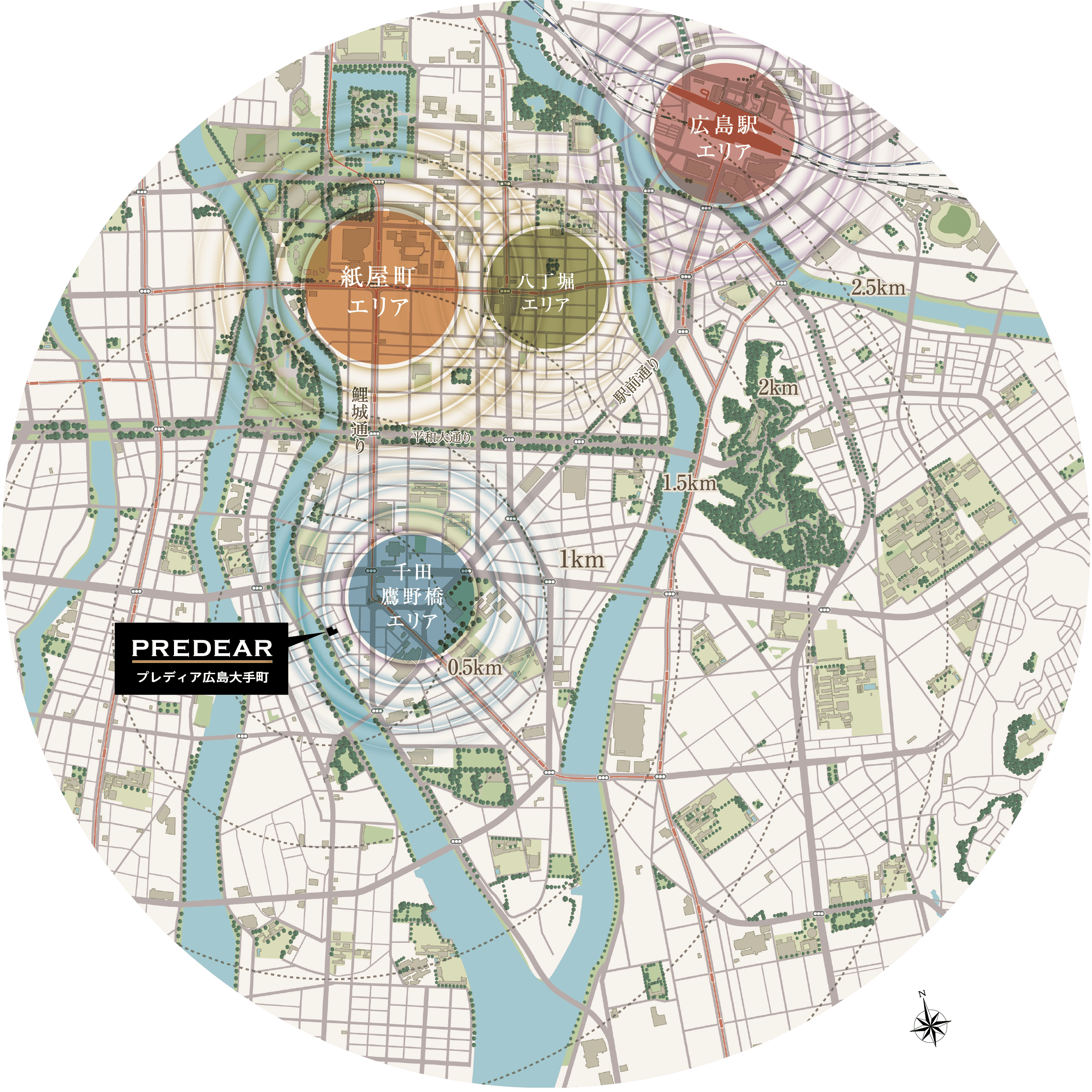 計画地からは、紙屋町1.5km圏、八丁堀1.6km圏、広島駅2.7km圏の近さ。