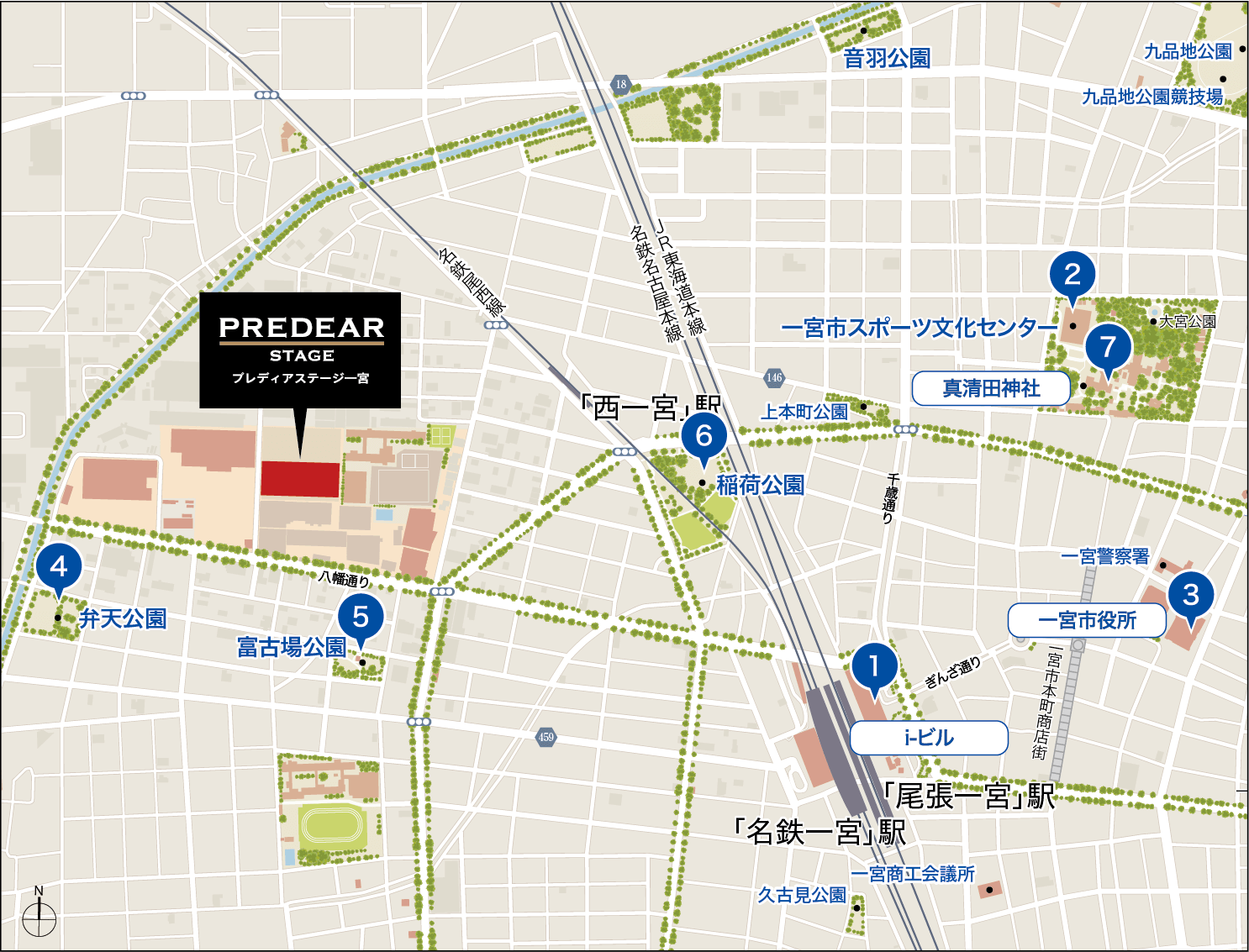 3.尾張一宮駅前ビル(i-ビル)/徒歩14分〜16分(約1,110m〜1,260m) 4.尾州ビレッジ/徒歩16分〜18分(約1,260m〜1,410m)※写真提供 尾州ビレッジ