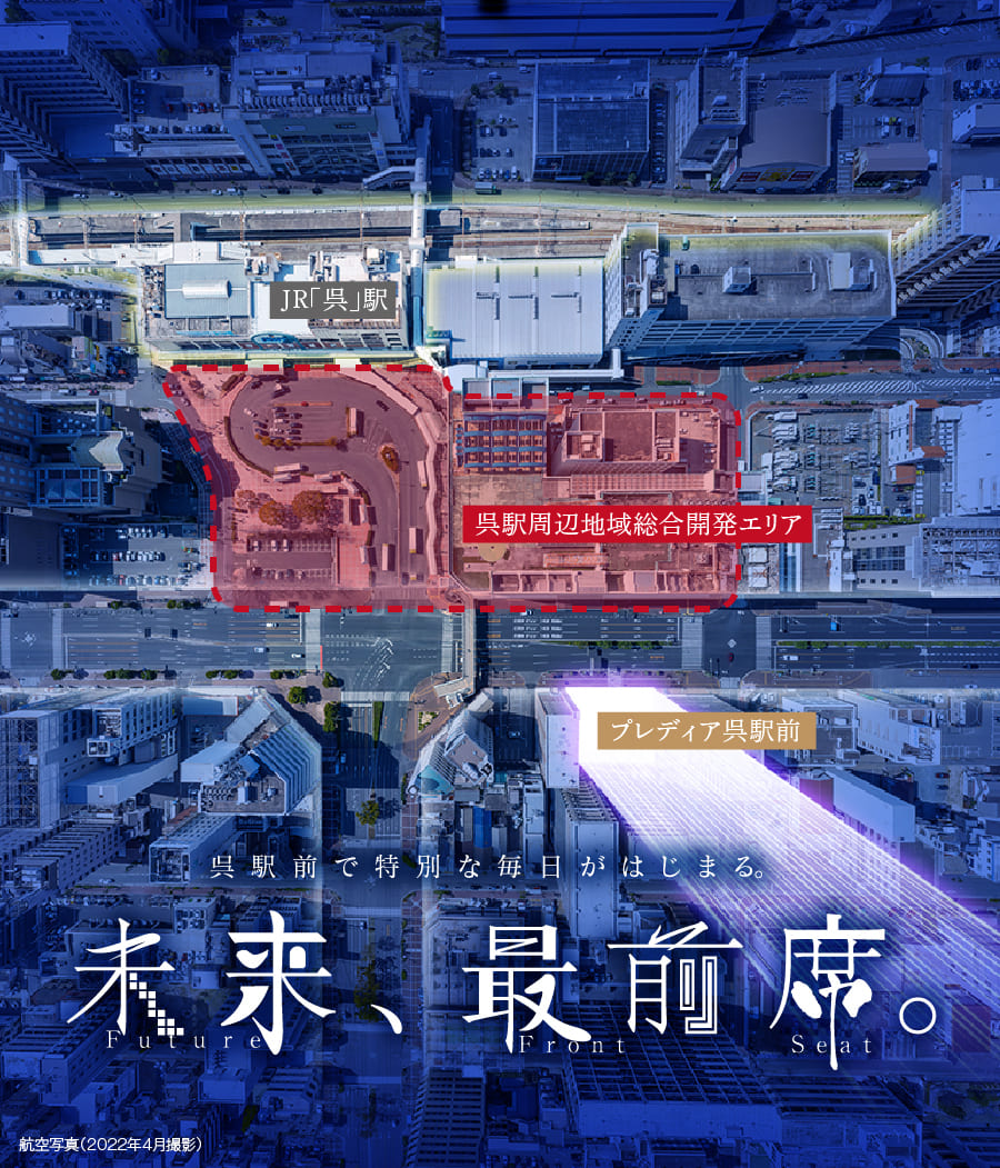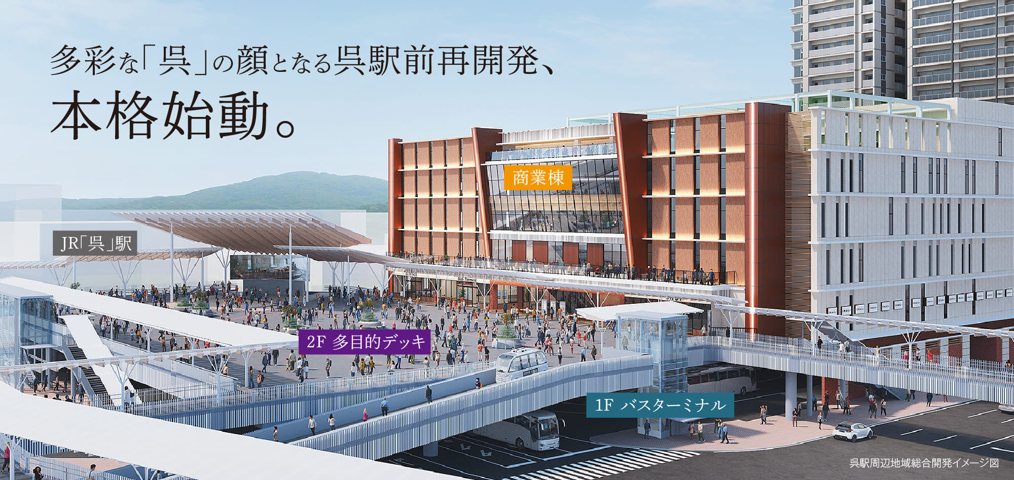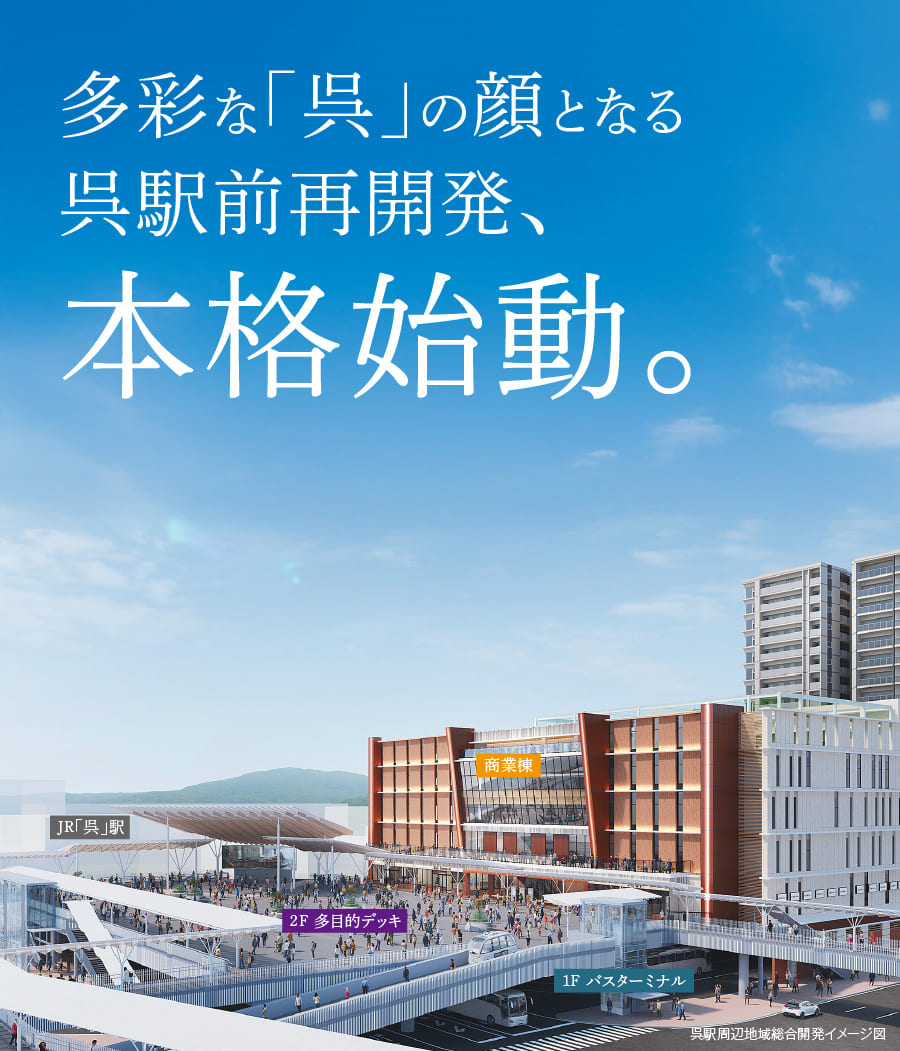 すぐ目の前のそごう呉店跡地や呉駅前をステージとして 動き始めた「呉駅周辺地域総合開発」。 商業施設をキーテナントとする複合施設の誕生※など、 夢のプロジェクトは豊かで彩りのある新生活へとつながる。