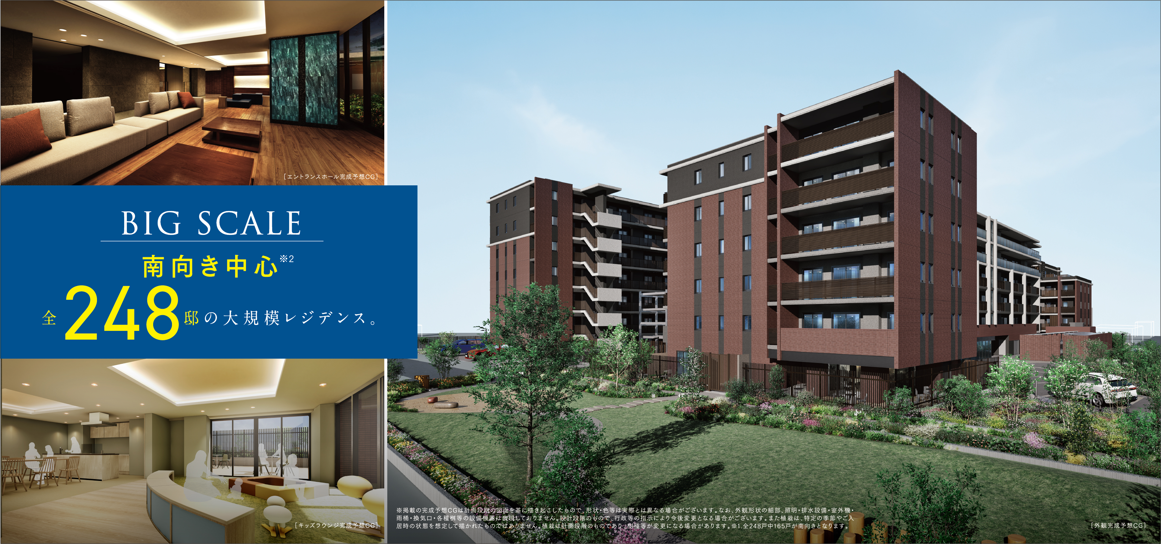 ※掲載の完成予想CGは計画段階の図面を基に描き起こしたもので、形状・色等は実際とは異なる場合がございます。なお、外観形状の細部、照明・排水設備・室外機・雨桶・換気口・各種桝等の設備機器は表現しておりません。設計段階のもので、行政等の指示により今後変更となる場合がございます。また植栽は、特定の季節やご入居時の状態を想定して描かれたものではありません。植栽は計画段階のものであり、樹種等が変更になる場合があります。