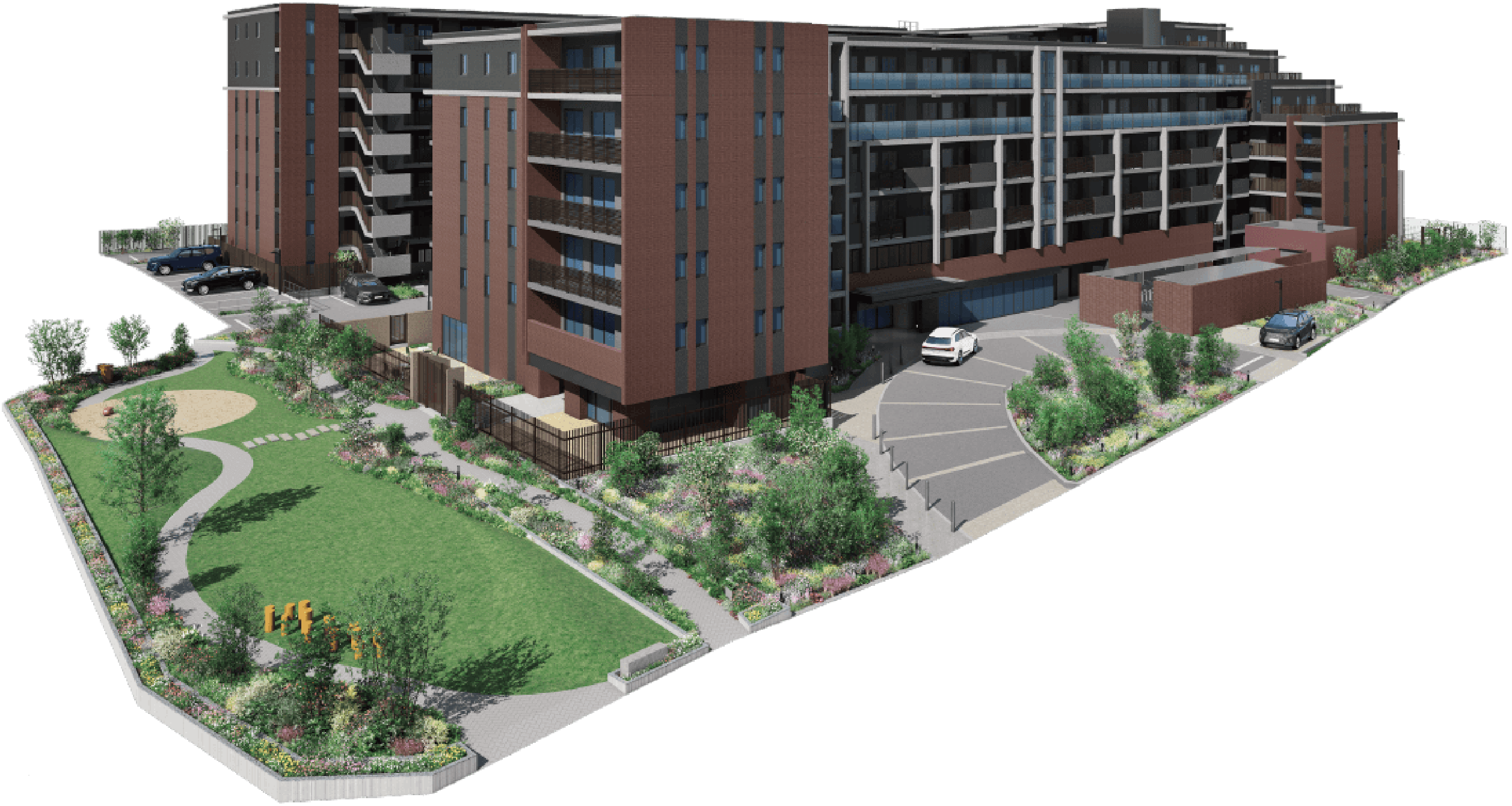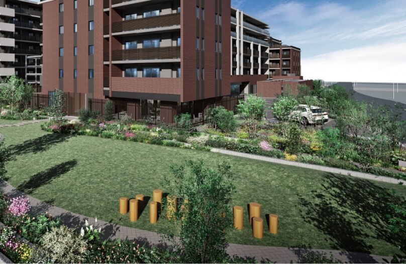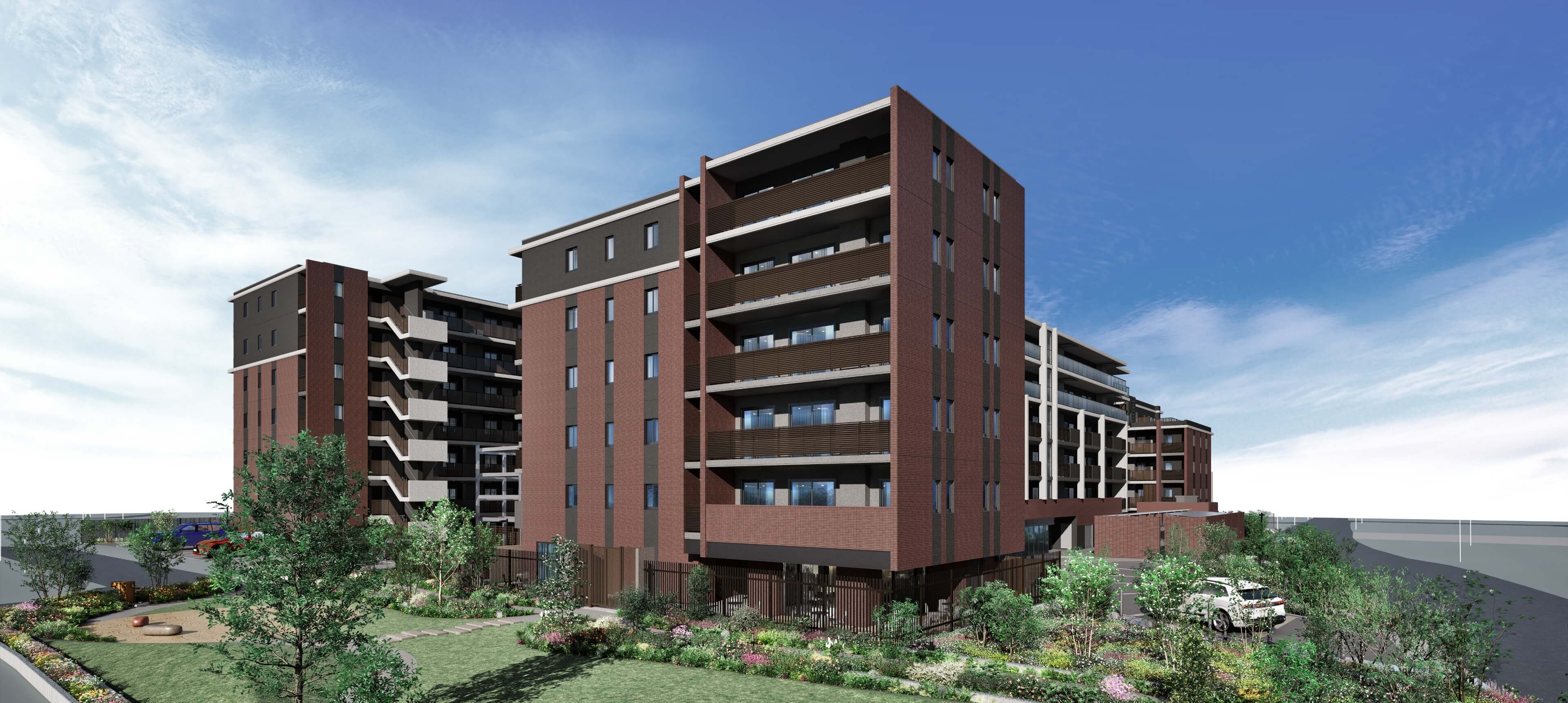 ※掲載の完成予想CGは計画段階の図面を基に描き起こしたもので、形状・色等は実際とは異なる場合がございます。なお、外観形状の細部、照明・排水設備・室外機・雨桶・換気口・各種桝等の設備機器は表現しておりません。設計段階のもので、行政等の指示により今後変更となる場合がございます。また植栽は、特定の季節やご入居時の状態を想定して描かれたものではありません。植栽は計画段階のものであり、樹種等が変更になる場合があります。