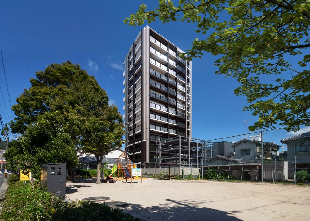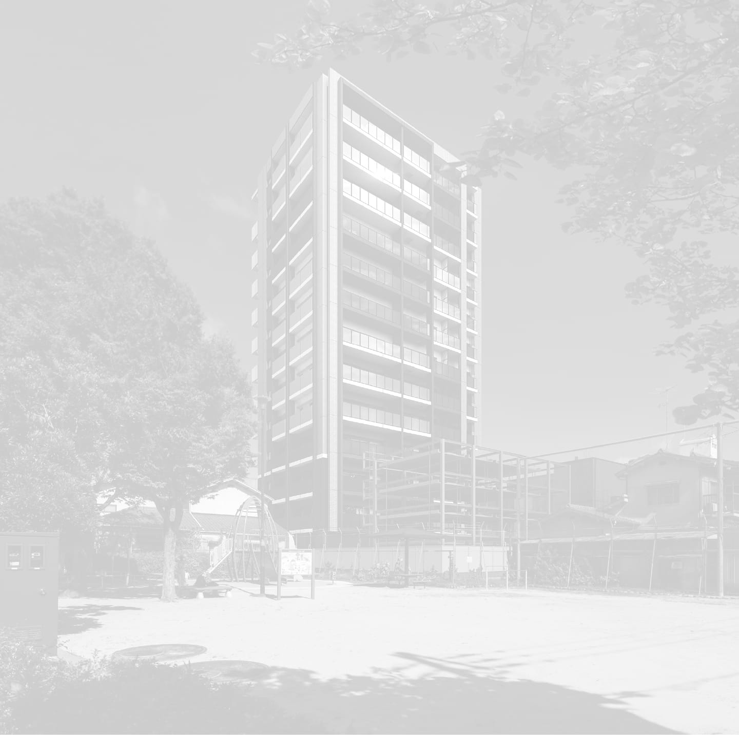 水平のスラブと縦に伸びる幅に変化を持たせた複数のマリオン、そして、色調を違えたガラスのバルコニー手摺によって構築された外観の意匠が時代性に流されることのない品格と洗練を際立たせ、時を紡いでいきます。
