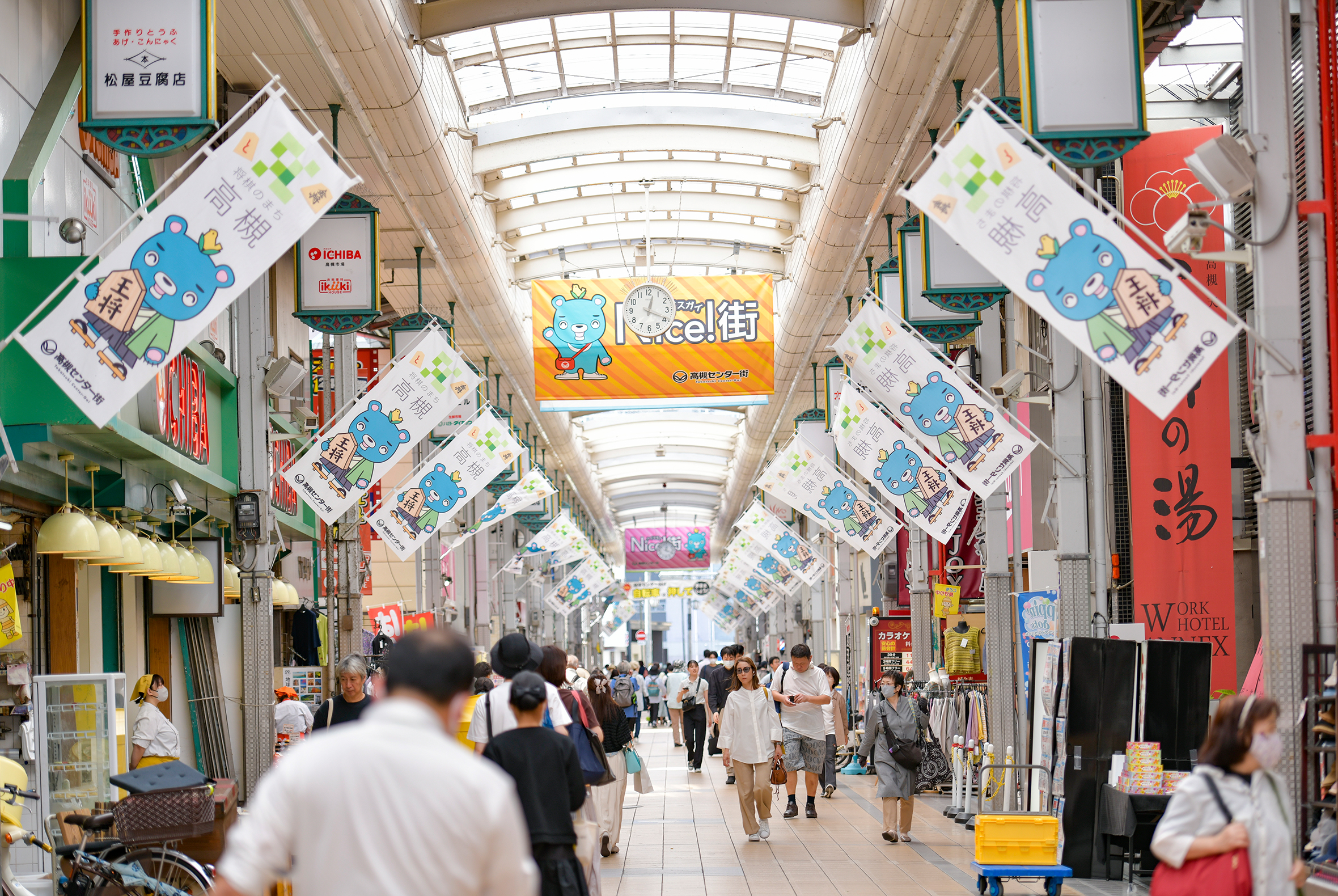 阪急「高槻市」駅とJR「高槻」駅の間には、両駅を結ぶように「高槻センター街」「たかつき中通り」「たかつき本通り」など多数の商店街があり、地元の方々に親しまれています。中でも「高槻センター街」は100年近い歴史を持つ商店街で、全長300mのアーケードに食品、ファッション、雑貨、飲食などバラエティに富む店舗が並び、多くの人で賑わっています。