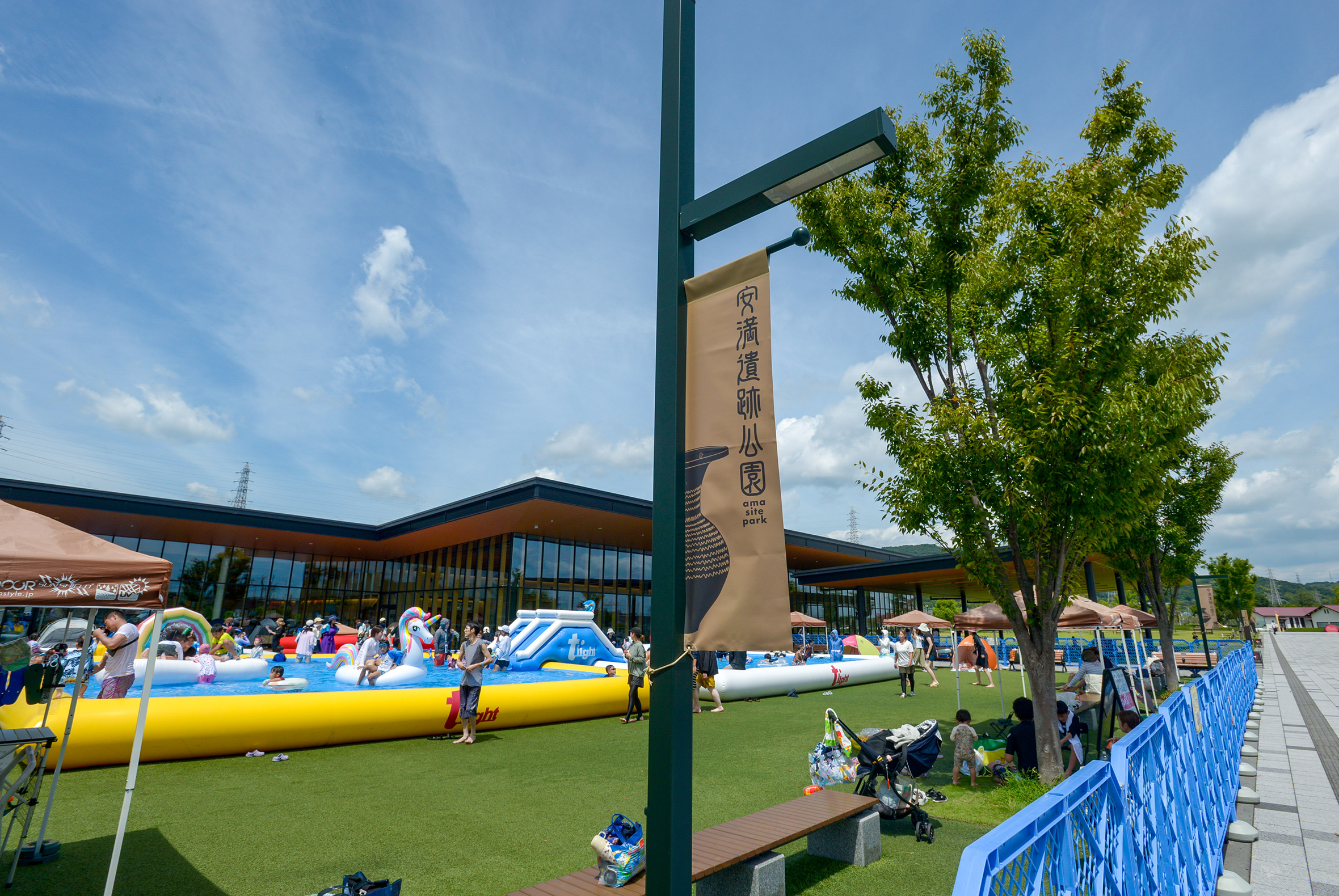 子供たちが喜ぶダイナミックな遊び場や遊具があり、一年を通して多くの家族連れで賑わう「安満遺跡公園」。園内西エリアの「ボーネルンド プレイヴィル」は、「世界のあそび道具」の販売で有名な「ボーネルンド」社が運営する子供の遊び場。屋内外一体型で、天候に左右されず利用できます。東エリアの人気は「ふわふわドーム」。大きな膜状のトランポリンです。