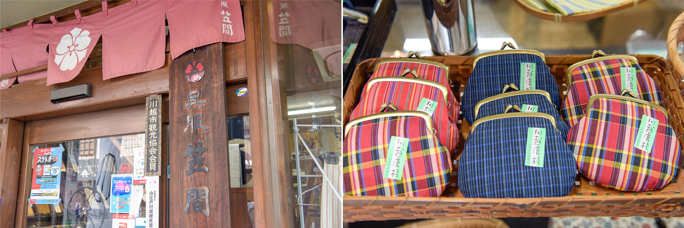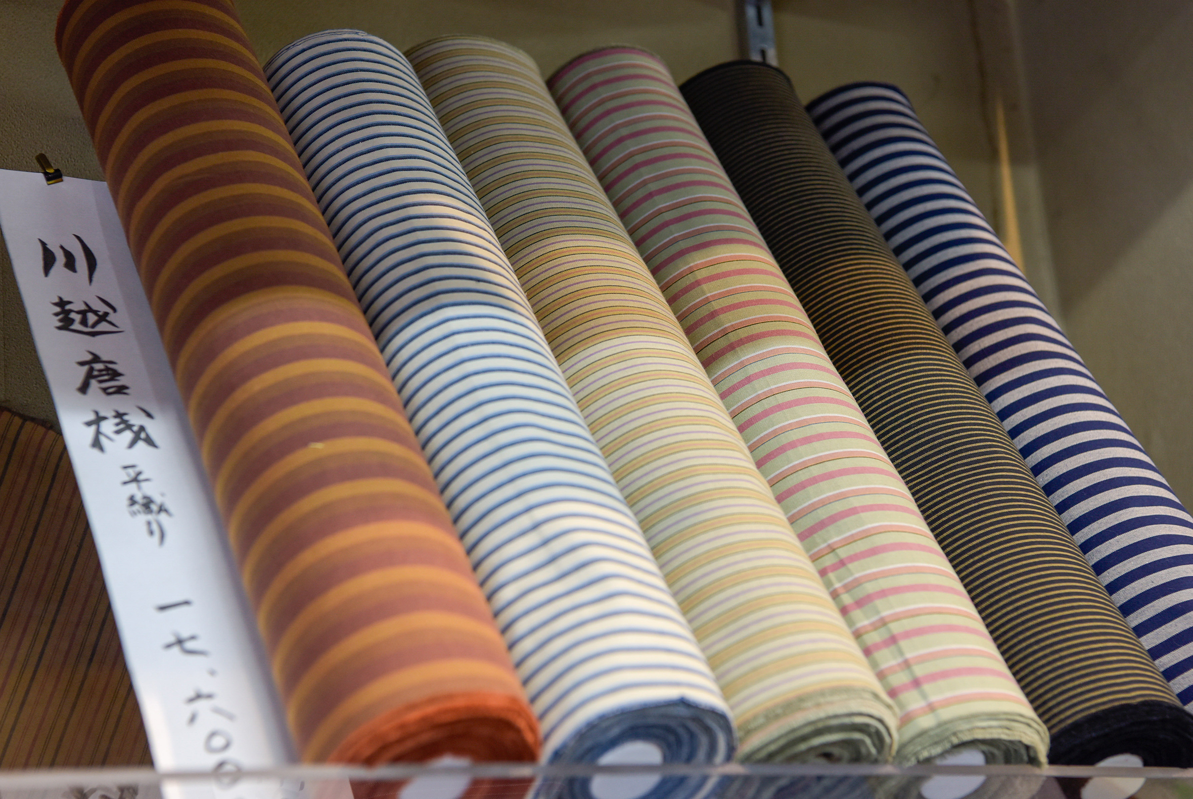 「プレディア川越新宿」の外観デザインのモチーフにもなっている「川越唐桟(かわごえとうざん)」は、絹のような風合いと粋な縞模様で江戸っ子を魅了した木綿の織物で、川越の伝統的な名産品です。創業115年の「呉服笠間」は、「川越唐桟」の着物や小物を取扱う老舗呉服店。手頃な価格の普段用着物も豊富に取揃えているので、着物初心者にもおススメです。