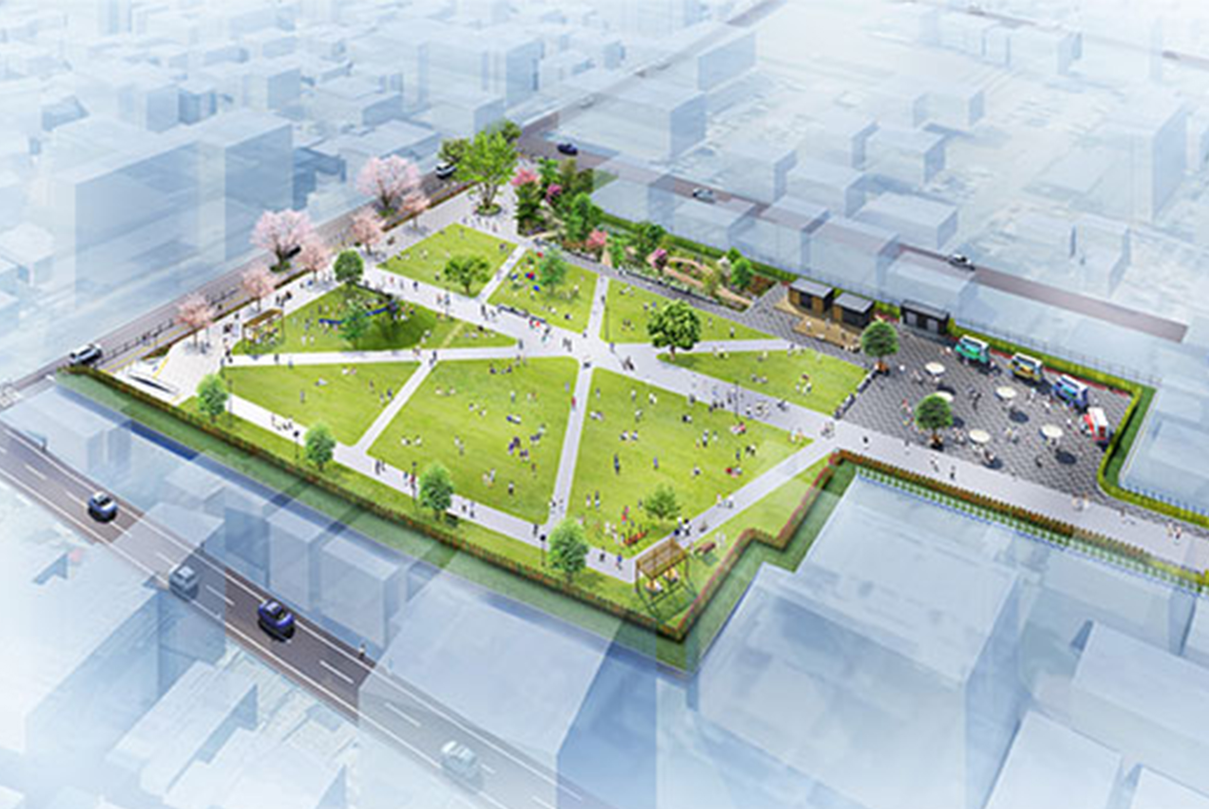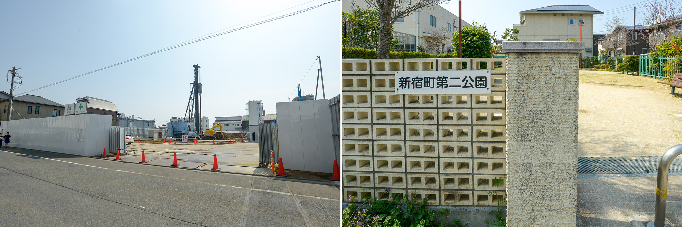 駅西口から南へ徒歩5分の場所で進められているのは「(仮称)新宿町1丁目広場整備事業」。約1.2ヘクタールという広大な土地に、芝生広場を中心とした緑溢れる地域住民の憩いの場が新たに誕生します。供用開始予定は令和8年。お子様用の遊具も設置されるほか、災害時には一時避難場所や災害救援活動拠点としても利用される予定です。