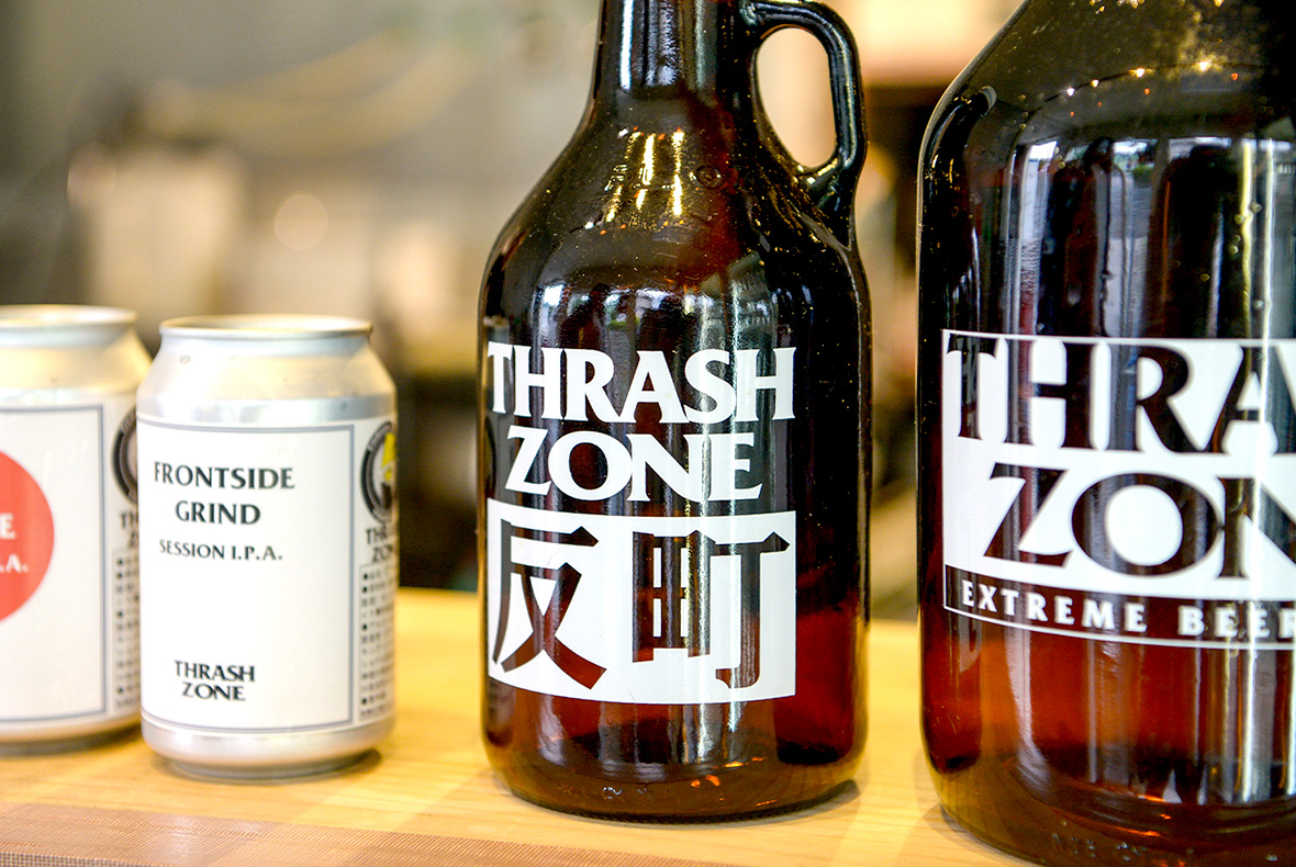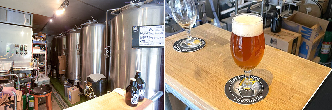 「反町」駅北側の「東横フラワー緑道」沿いに面白いお店があります。横浜のビール好きなら誰もが知っている、横浜を代表するクラフトビールの名店「THRASHZONE(スラッシュゾーン)」のビール醸造所&立飲みビアバー「THRASHZONE反町ブルワリー」です。グラウラー(瓶の容器)で持ち帰ることもできるので、出来立てのクラフトビールをご自宅でも楽しめます。