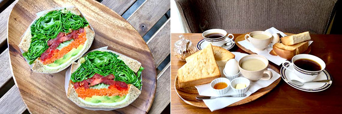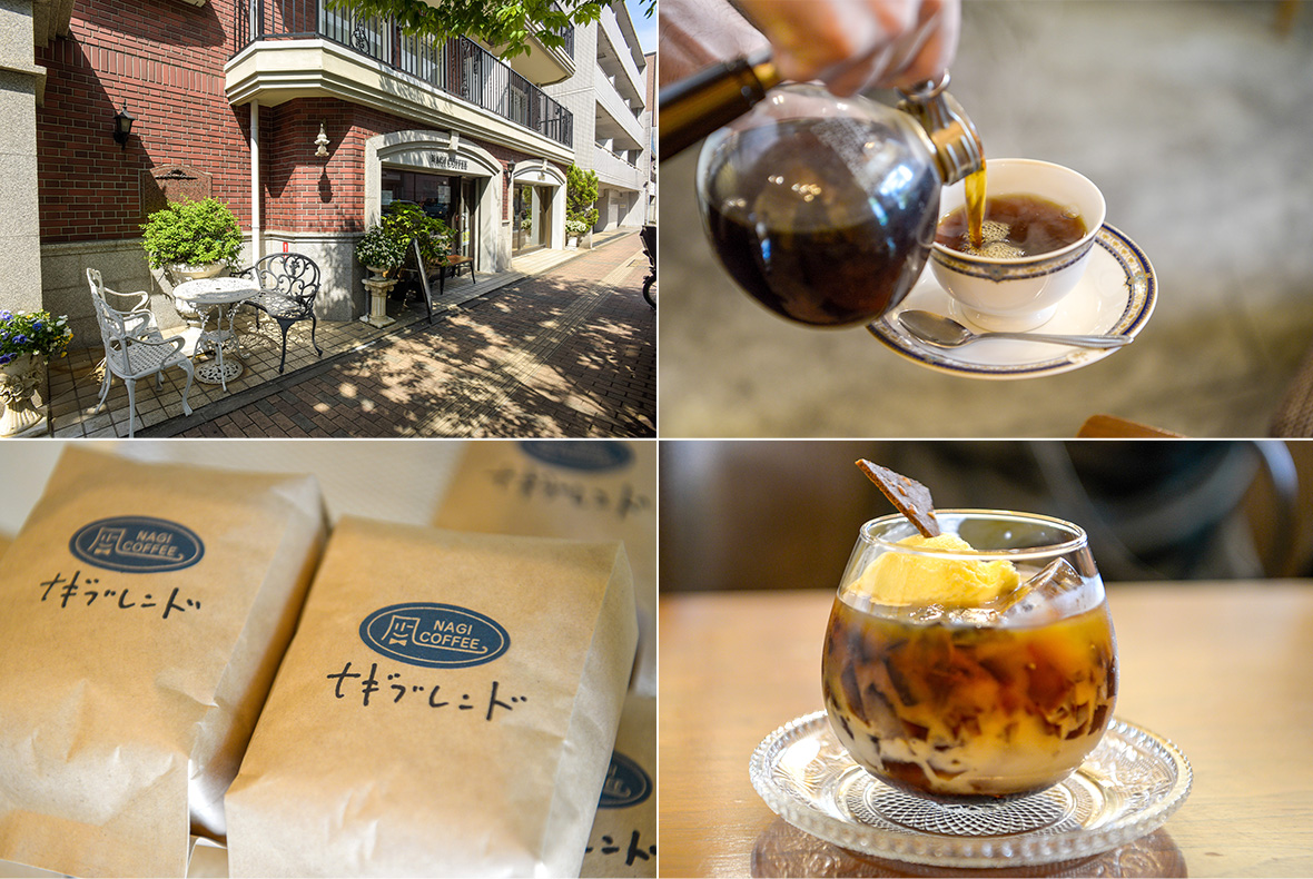 「纜」から北方面に少し進んだところにある「NAGI COFFEE」は、自家焙煎珈琲の専門店です。丁寧に長時間焙煎した香り高い珈琲豆をアルコールランプのサイフォンで抽出したこだわりの一杯が、くつろぎ感溢れる店内で愉しめます。トーストやサンドウィッチ、スイーツなどのカフェメニューも豊富。7時半からのモーニングメニューは、休日の朝食におススメです。